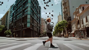 Autos voladores, martillos neumáticos que se desprenden del asfalto, un desfile circense que se eleva al cielo: todo transcurre en el microcentro. El rodaje y